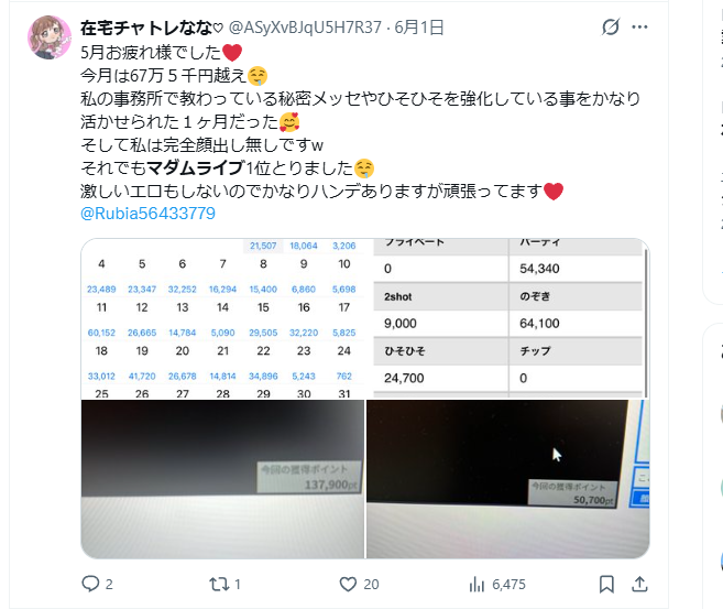 | 在宅2ショットチャット報酬 | 1分 75円 |