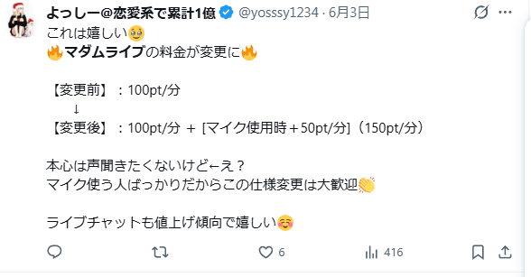 | 通勤パーティーチャット報酬 | 1分 ~34円 × 人数 |