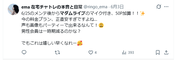| 在宅パーティーチャット報酬 | 1分 50円 × 人数 |